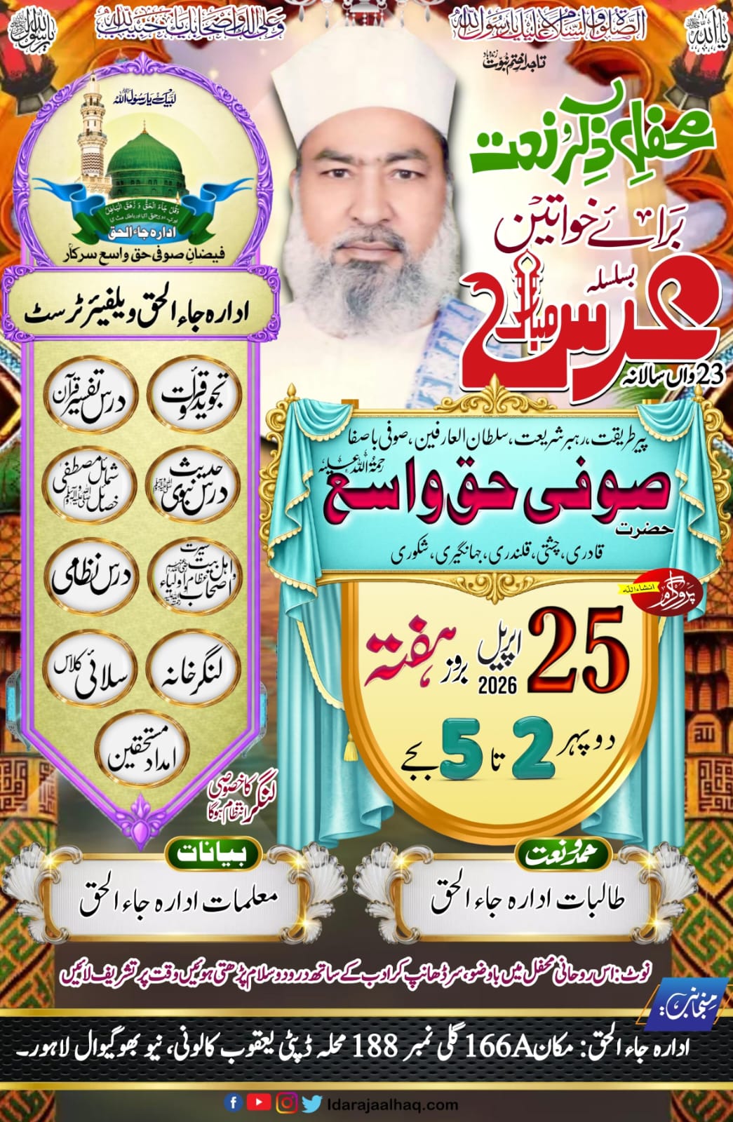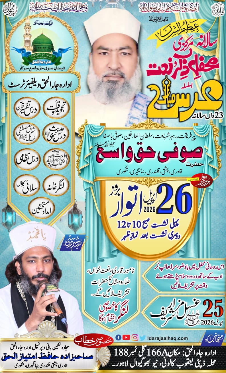 حضرت صوفی حق واسع رحمۃ اللہ علیہ کے تئیسویں 23سالانہ عرس مبارک کے سلسلہ میں خواتین کیلیے محفل 25 اپریل بروز ہفتہ ظہر یا عصر