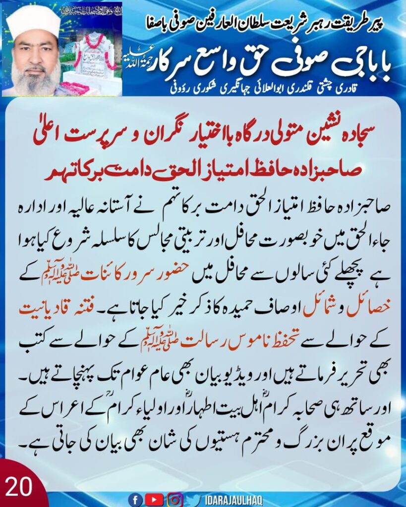 حق تعالیٰ خود حق کے راستے پر چلنے والوں کا ساتھ دیتا ہے صاحبزادہ صاحب حافظ امتیاز الحق صاحب نے ثابت کرکے دکھایا کہ عمر چھوٹی ہے تو کیا ہوا؟ دنیاوی مال و اسباب نہیں تو کیا ہوا؟ قبلہ بابا جی سرکار نے جو تعلیم دے دی تھی جو سکھا دیا تھا جس راستے پر چلا دیا تھا پھر کسی اور کا حکم نہیں ماننا تھا۔ بس مرشد کے حکم کو مان کر چلتے رہے۔ عام طور پر اس عمر میں بچے یتیم ہو جائیں تو انہیں کچھ سمجھ نہیں آتی پریشان ہو جاتے ہیں کہ اب کیا ہوگا لیکن اس گھرانے کے بچے بہت صابر شاکر اور خود دار اور اللہ کی ذات پر بھروسہ کرنے والے ہیں ۔ اور خاص طور پر صاحبزادہ صاحب حافظ امتیاز الحق صاحب نے اپنے فرائض ایسے پورے کیے کہ حضرت امام زین العابدین کی قدموں کی خاک بن کر ان کے نقش قدم پر چلتے ہوئے دین کی خدمت کی ۔ اور اس راہ میں لوگوں کو اپنے ساتھ لے کر چلے۔ ( کسی ذاتی کام کے لیے نہیں بلکہ غریبوں میں راشن تقسیم کرنے کا معاملہ ہو یا کسی غریب کی بیٹی کی شادی کے لیے جہیز کا معاملہ ہو تو اس وقت آستانہ پاک میں آنے والوں سے کہا جاتا ہے کہ حصہ ڈالیں)۔ صاحبزادہ صاحب حافظ امتیاز الحق صاحب نے ایک سچے عاشق رسول کی طرح ہر محاذ پر دین کی خدمت کو مقصد حیات بنا لیا۔