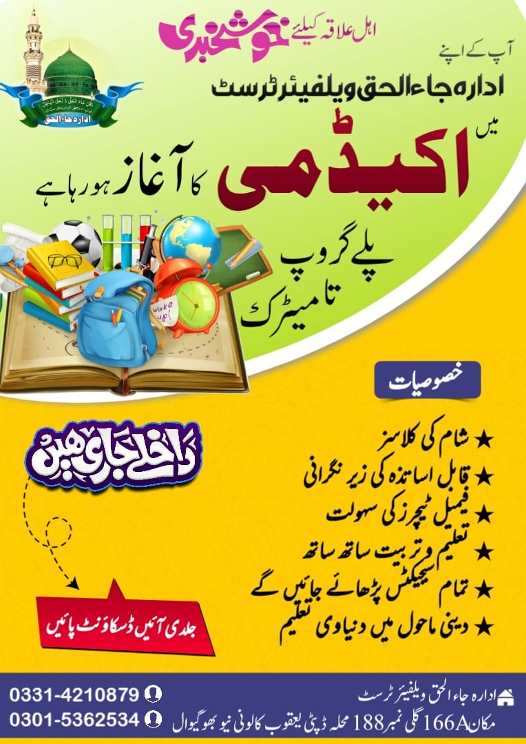 ادارہ جاء الحق میں اکیڈمی کا آغاز ہو رہا ہے تاکہ یہاں تعلیم حاصل کرنے والے طلبہ و طالبات کو دنیاوی تعلیم کے حصول میں