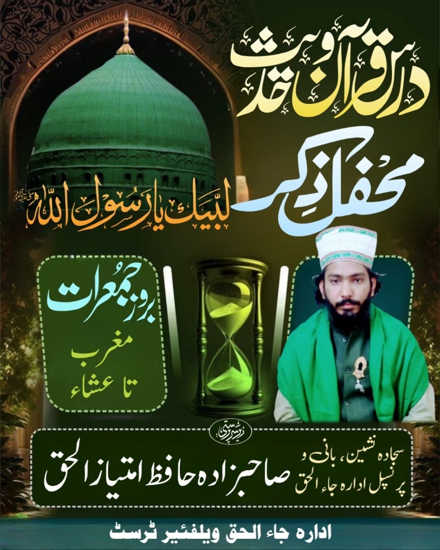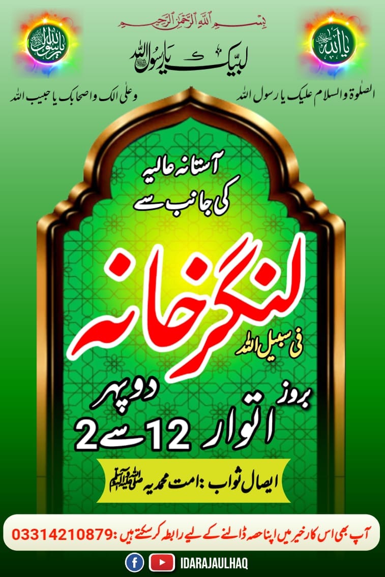 ادارہ جاء الحق کے زیر اہتمام آستانہ عالیہ قادریہ چشتیہ کی جانب سے حافظ امتیاز الحق کی زیر نگرانی233 بی بلاک ریوینو سوسائٹی میں ہر